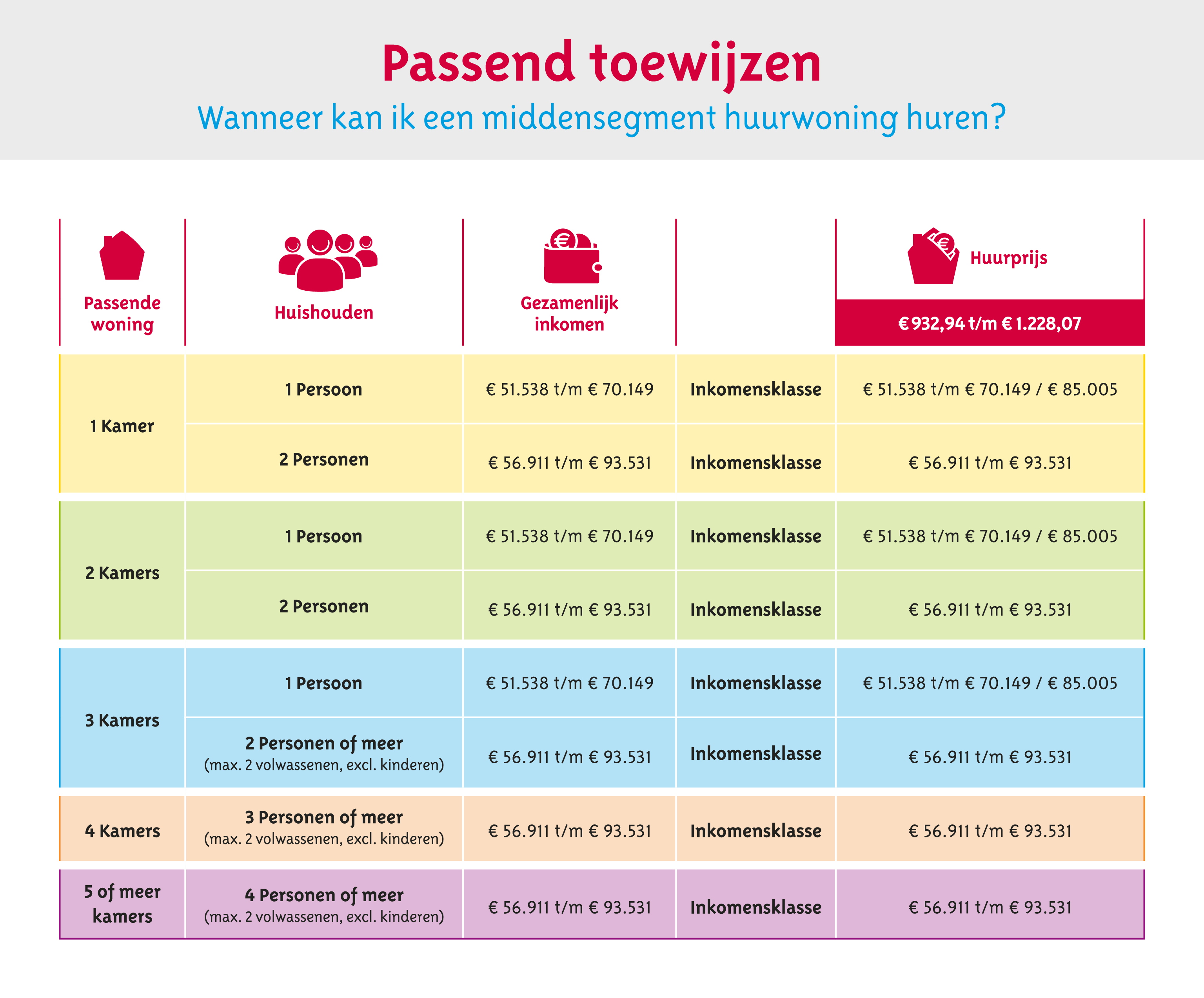 Al een paar jaar wijzen woningcorporaties hun sociale huurwoningen passend toe. We doen dit nu ook met onze middensegment huurwoningen. We kijken of de grootte van de woning en de huur passen bij het inkomen en het aantal personen waarmee je gaat wonen. Zo krijgen meer mensen een woning die past bij hun situatie.