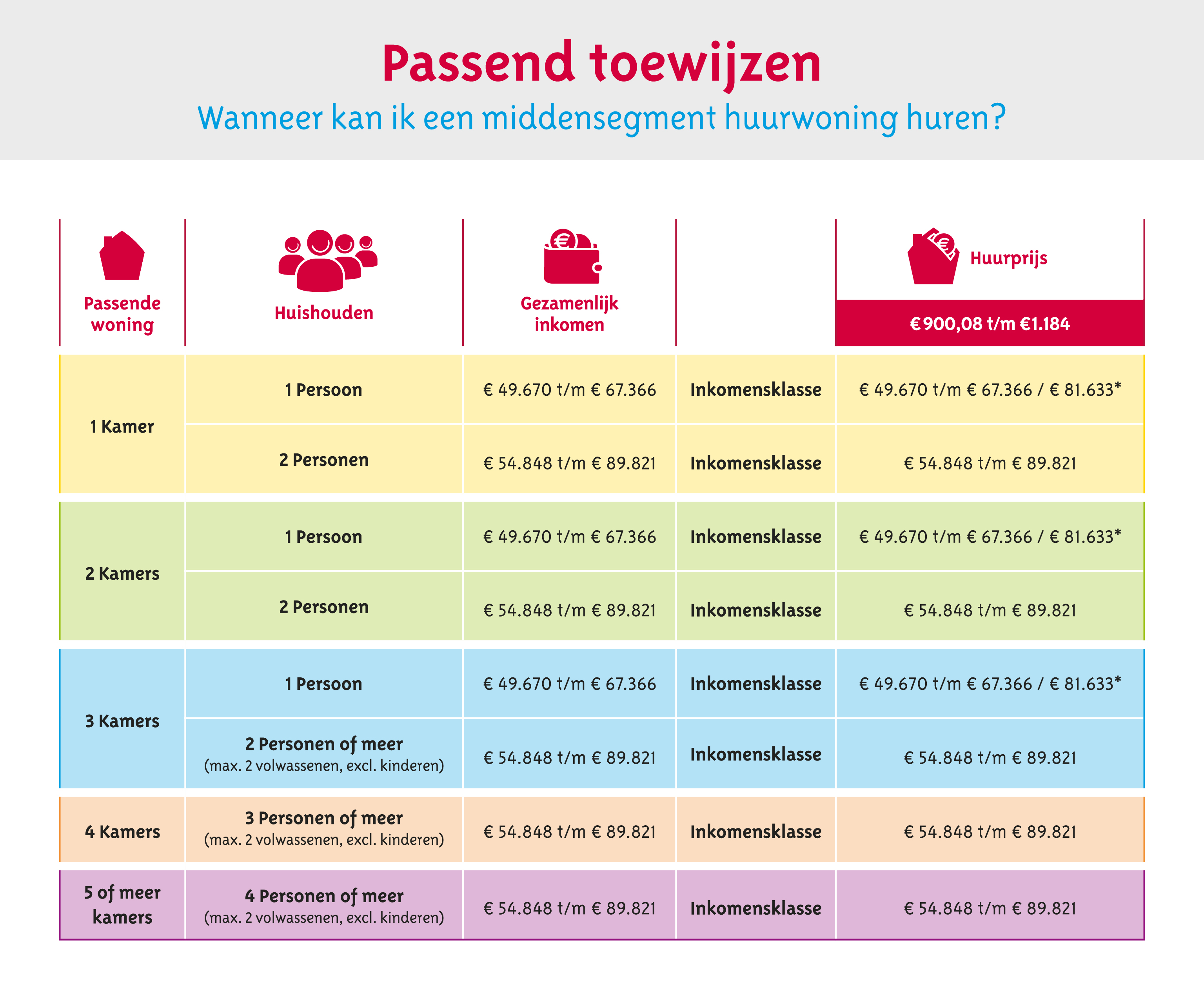 Al een paar jaar wijzen woningcorporaties hun sociale huurwoningen passend toe. We doen dit nu ook met onze middensegment huurwoningen. We kijken of de grootte van de woning en de huur passen bij het inkomen en het aantal personen waarmee je gaat wonen. Zo krijgen meer mensen een woning die past bij hun situatie.